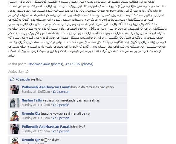 این ادعاهای احمقانه و مسخره تنها نشاندهندهی عمق بیسوادی و درماندگی نویسندگان آن و شدت دشمنی هیستیریک و روانپریشانهی آنان نسبت به زبان پارسی است. این ادعاها دربارهی زبان ترکی تا آنجا پیش میرود که مینویسد: